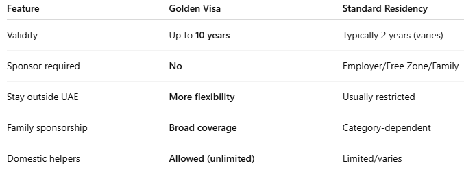 The UAE Golden Visa grants long-term residency (up to 10 years) to eligible applicants and their families. With it you can: